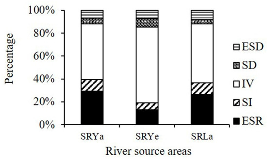 We further summarized the proportions of areas with different grassland degradation/restoration situations based on significant levels in the three sub-region (SRYa, SRYe and SRLa) (Figure 7). The restorable area was larger than the degenerating area in each sub-region. The grassland in SRYa of ESR, SR, IV, SD, ESD accounted for 29.50%, 10.10%, 48.69%, 4.92% and 6.78%, respectively. The grassland in SRYe, ESR, SR, IV, SD, ESD accounted for 12.93%, 6.17%, 66.11%, 7.23% and 7.56%, respectively. The grassland in SRLa, ESR, SR, IV, SD, ESD accounted for 26.55%, 10.08%, 51.43%, 3.70% and 8.24%, respectively. Grassland in SRYa had the maximum percentage of restoration, while grassland in SRYe had minimum percentages of degradation.
