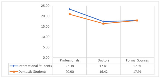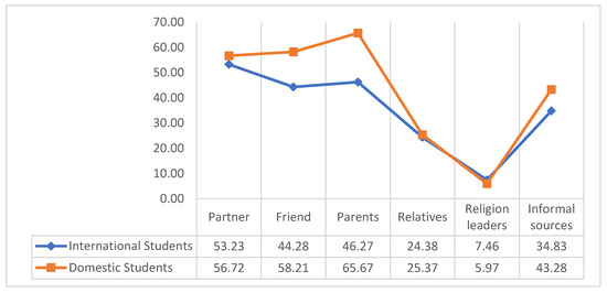 According to this study, seeking help from informal sources was the most prevalent in both international and domestic students at 34.83% and 43.28% respectively, while the percentage of students seeking professional help (psychologist, social worker, or counsellor) was not high, at lower than 18%. The current result confirms the finding of Lindsey et al. that adolescents most often share emotional problems with their family [73]. In addition, the high proportions of international and domestic students seeking help from informal sources show consistency with another study on Japanese college students. Yeh et al. reported that 60% and 40% of students participating in their surveys were more likely to seek help from friends and siblings, respectively [25]. These findings support the Network Episode Model, which emphasizes the essentiality of informal sources, such as parents and friends for information, advices, expressive or emotional support, and so on, during times of emotional difficulty [26,74]. Another explanation for the different percentage between seeking help from informal and formal sources is that behaviors are shaped and influence by cultural roots [75]. Most of the participants in this study were from East and South East Asia, where professional mental help was under-developed, mental health was less taken care of, and mental illness treatment sometimes looked down as shameful activities [76]. Thus, Asian students are more willing to seek help from their interpersonal network rather than professional helps [16].