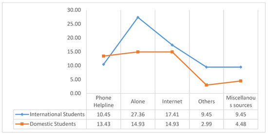 Another finding of this study is that domestic students were more likely to seek help from informal sources than international students, whereas solutions that did not need much interactions with other people, such as finding help from the Internet and dealing with the problem alone, were more preferable among international students than domestic students. It is more challenging for international students to find advices or emotional support from parents or friends [77], as they are studying abroad and many of their family and friends—those from high school, for example—are far away. Moreover, living in a different cultural environment also restrains the ability to make new friends of international students. Assuming support from friends and parents to be a type of mental health support, domestic students would be having more access to help-seeking service than international students. As a result, international students are less likely to seek help from parents and friends and more likely to self-help and seek help from the Internet than domestic students [16,26].