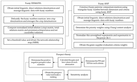 MCDM is a method that simultaneously considers multiple criteria and aids in decision making by estimating the best case for each criterion after sorting limited available cases according to different characteristics or criteria. This study proposes a fuzzy set to address concerns related to decision uncertainties [32,33,34], comprising fuzzy DEMATEL-ANP based on prospect theory. First, fuzzy DEMATEL is used to confirm the cause and of each criterion and to investigate the linkage between each of the criteria. To subsequently calculate the weight of the criteria for green supplier selection, a newly introduced integration of fuzzy DEMATEL and fuzzy ANP is also adopted. These methods are capable of solving the criteria issues, namely dependency and feedback [2]. Finally, the psychologically influenced behavior of the decision maker in supplier selection under environmental stress has also been measured to assign a weight to each alternative by using prospect theory.