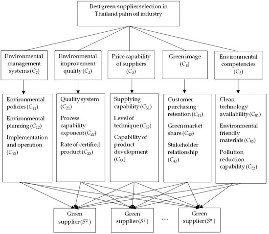 In Thailand, green concepts have been widely applied in many industries including the palm oil products industry. Palm oil is an essential raw material for producing certain types of products such as fuels and various consumer goods; thus, the demand for palm oil in Thailand has continuously risen [3]. Many manufacturers who require raw palm oil for their production inputs are paying attention to involvement in green supplier selection in order to support global sustainability by considering several related conditions. Generally, the company would closely evaluate relevant green factors when choosing a supplier of palm oil. However, green factor evaluation might not be efficient due to unscientific decision-making, possibly leading to the loss of profits and of the ability to compete in the market. Moreover, a misleading green evaluation may also negatively influence the whole supply chain, including both upstream and downstream operations, and finally leads to negative impacts on the company’s reputation, particularly regarding corporate social responsibility.