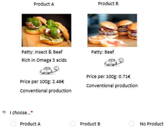 In detail, the participants of the choice experiment were asked to choose between two different burger alternatives and a no choice alternative. An exemplary choice set is shown in Figure 1. Each alternative was characterized by six attributes: Production method (conventional vs. organic), health claim, visual impression, carbon emissions, composition of the burger patty, and the purchase price. Purchase price and the level of carbon emission have three levels, while all the other attributes are binary. Each attribute was explained in greater detail to the respondents prior to the experiment. The attributes were chosen based on the significance in the purchase decision of consumers and the characteristics associated to insect based products. The production method and the visual absorption are important attributes of meat products []. Both health claims and carbon emissions are related to the source of animal protein as discussed in the introduction. Furthermore, the coefficient estimate for the purchase price facilitates the computation of willingness-to-pay estimates.