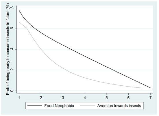 To illustrate the implications of the attitudinal characteristics of the respondents, we present the predicted probabilities of being ready to consume insects in the future and the predicted probabilities of past consumption of insects in Figure 2, Figure 3 and Figure 4 for selected attitudinal variables of the respondents and across the range of the values of the respective variable. Figure 2 shows the probability of being ready to consume insects in the future dependent on the consumers’ aversion towards insects and the food neophobia score. Both variables are measured by a score from 1 to 7. The predicted probabilities indicate how different levels of the variables are related to the likelihood of future insect consumption holding all other variables at the means. For instance, a respondent with a food neophobia score of 1, which is the lowest level of reluctance to eat new food products, has a probability of almost 80% to be ready to consume insects in the future. On the other hand, respondents with a food neophobia score of 7 are ready to consume insects in the future with a probability of only 2%. Generally, the association is linear. The importance of the aversion towards insects score on the predicted probabilities appears to be less pronounced and has a negative exponential trend. At the sample mean of 2.3, a respondent’s probability of being willing to consume insects in the future is about 35% and increases to above 60% for a score of 1, while it remains constantly low at a score above 4.0.