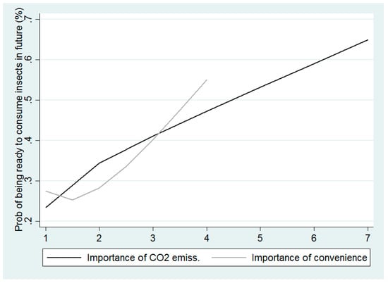 Predicted probability of being ready to consume insects in the future on the importance of CO2 emissions and the importance of convenience products scores.