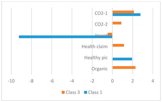 Combining the coefficient estimates and the determinants of the class membership is very meaningful and let us describe the consumer group of early adopters of insect-based food products and their attitudes. Therefore, we classify members of class 3 as “adventurers and ecological consumers”, while class 1 contains “insect neophobic conservative consumers”. Class 2 respondents seem to be ecologically concerned and infrequent meat consumers and are unlikely to belong to the market segment for burger patties, regardless of the insect content. Respondents of the class of “adventurers and ecological consumers” also have positive and significant willingness-to-pay for organically produced burger patties, a positive health claim, and lower levels of CO2 emissions during the production of the burger meat. This indicates that a higher preference for healthier products is a main motivation to adopt insects into human consumption as a substitute for meat products, which are often, if frequently consumed, considered to increase the risk of cardiovascular diseases. Insect consumption, on the other hand, is not associated with an increasing health risk, and some research even provides evidence for bioactive compounds in insects, which could have the potential to reduce health risks []. In line with this, potential adopters of insects appear to be better educated than non-adopters. The remaining respondents are not willing to consume insect-based products in the near future. However, they also reveal a positive willingness-to-pay for a healthy visual impression of the burger and lower CO2 emissions. The class of “adventurers and ecological consumers” is more interested in trying new and exotic foodstuffs, which supports the findings by Hartmann and Siegrist [].