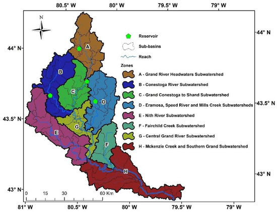 - GRCA. Grand River Watershed Characterization Report; Grand River Conservation Authority: Cambridge, ON, Canada, 2008. [Google Scholar]