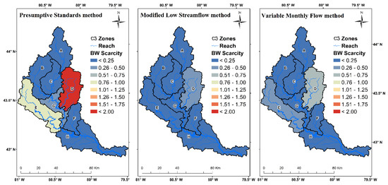 - Blue water security analysis showed contrasting results for different EFR methods used. The presumptive method was found to be the most restrictive and conservative when compared to others. The blue water was scarce in some regions of the GRW and was found to be severe in specific periods, especially for the Eramosa and Speed river sub-watershed and in summer months, on account of the higher percentage of urban area, more water use, and less blue water availability.