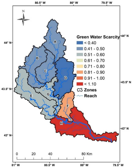 - Green water security analysis showed that the basin had no severe green water scarcity, and that it was adequate enough for practicing rain-fed agriculture in spring and fall seasons. It was found to be the highest in the southern Grand River sub-watershed because of the higher temperature, larger green water footprint, and lower green water availability.