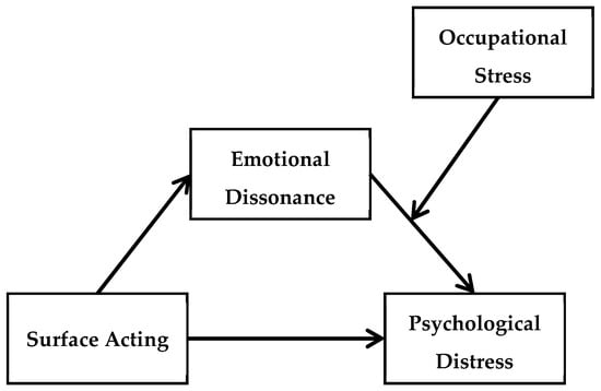 There are two strategies of emotional labor: surface acting and deep acting. Deep acting indicates that employees try to create feeling that must be expressed, while surface acting refers to their merely putting on a mask [11,12]. When there was a discrepancy between felt emotions and displayed emotions, employees suffered from emotional dissonance, which is an important component of emotional labor [11]. The previous findings showed that emotional dissonance is associated with burnout and mediates between the association between emotional labor and employees’ well-being [13,14]. Therefore, it is possible that emotional dissonance mediates the association of emotional labor with psychological distress.
