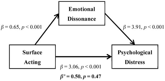 Mediation model showing that the effect of surface acting on psychological distress is mediated by emotional dissonance. Change in beta weight when the mediator is present is highlighted in bold.