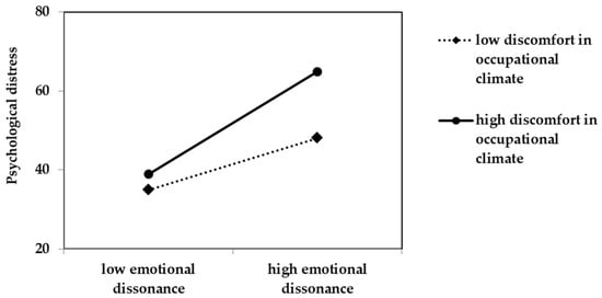 The association between emotional dissonance and psychological distress was plotted when the levels of discomfort in the occupation climate was 1SD below and 1SD above the mean. This represents the simple effect of emotional labor at two levels of discomfort in the occupational climate (as a moderator) [32]. Figure 4 depicts emotional dissonance moderated by discomfort in occupational climate.