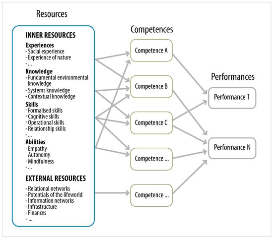 The value of this model is that it distinguishes between resources, competences, and performances. Indeed, in teaching situations, it is only possible to transmit and train resources, not competences [64]: theoretical debates on competences insist on the fact that competences can neither be transferred nor taught, but only acquired in a specific context [2,18,30,65]. A competence is expressed in a performance (Gestaltung or shaping) and can thus only be assessed in the actual achievement of a task when solving problems and dealing with challenges. However, a performance never reveals a person’s entire competence: it only shows the part that enables a person to act in a specific situation [61]. This is another reason why the context is so important in describing competences. In addition, when sustainable development is defined as the ultimate goal of education, as is the case for ESD, it is essential to integrate the value dimension of action in the definition of competences; in Figure 1, values are implicitly integrated in the inner and external resources, thus also permeating the competences and performances.
