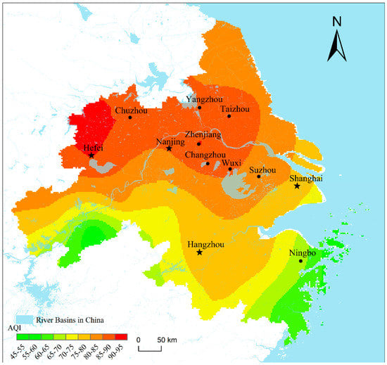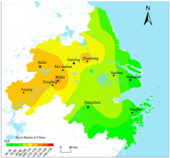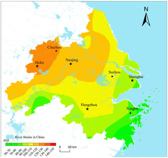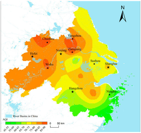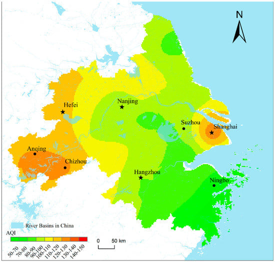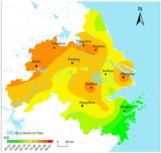 Spatial distribution patterns of annual air quality index (AQI) of the Yangtze River Delta (YRD) in 2015.