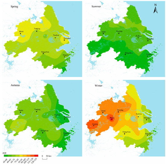 The characteristics of seasonal changes in haze pollution in the Yangtze River Delta are obvious and follow winter>spring>autumn>summer characteristics. The air quality index (AQI) of spring, summer, and autumn is between 45 and 95, indicating that the overall air quality is good and rarely contains haze pollution (Figure 7). In summer, due to abundant precipitation and favorable meteorological conditions to pollutant diffusion, AQI in all cities is the lowest, and the difference is relatively small year over year, from summer to summer. The AQI in winter decreases significantly, and haze pollution spreads in a wide range and has a large spatial difference. The polluted areas are mainly clustered in the northwest of Yangtze River Delta. These include urban agglomerations, such as Anqing, Wuhu, Tongling, Chizhou, Maanshan, Hefei, Chuzhou, Nanjing, and Zhenjiang, among which Anqing and Wuhu are the most highly polluted. If people are in such an atmosphere for a long time, they would probably be adversely affected. Conversely, AQI in the southeast coastal cities of the Yangtze River Delta is relatively good, among which Zhoushan City has the best air quality.