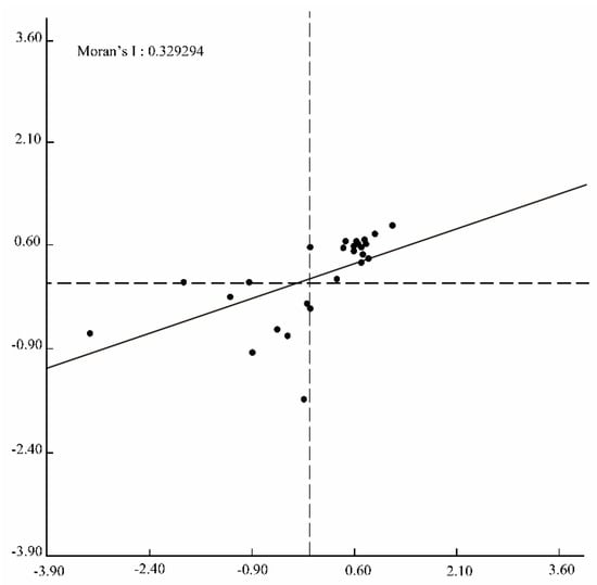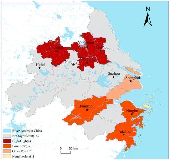 The positive local Moran’s I indicates that a high value is surrounded by a high value (high–high), or a low value is surrounded by a low value (low–low). The negative local Moran’s I indicates that a high value is surrounded by a low value (high–low), or a low value is surrounded by a high value (low–high).