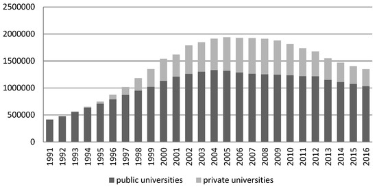 At the beginning of the period of transformations, there were about 100 higher education institutions in Poland, attended by circa 415,000 students. The following years saw an increase in the number of universities, especially non-public colleges of higher education, and consequently an increase in the number of students studying in Poland. The year 2005 was climactic in terms of the number of people pursuing studies, when about 2 million students were enrolled in higher education. All in all, there were 445 institutions of higher education, of which only 130 were public, the others being private. Afterwards, relative stabilization in terms of the number of students could be noticed. However, starting with 2009, the number of students as well as higher education institutions in Poland began to fall. In 2016, there were “only” 390 higher education institutions with 1.35 million students enrolled [19,20,21]. At least two key reasons for the decreasing number of students in Poland can be noted.