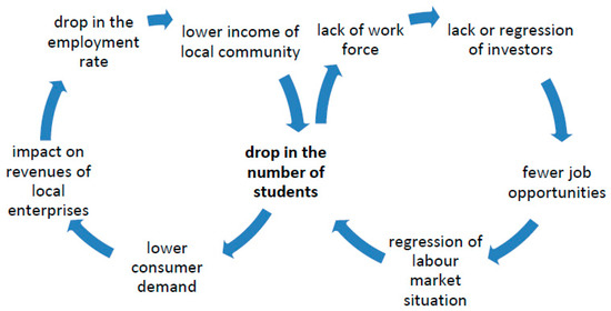 Changes in the number of students studying in academic cities may entail a number of economic consequences. In the period of growth in the number of students, they gave a development impulse to the local economy, but during the period of their number “shrinking”, it was quite on the contrary—they brought about an economic “collapse” of academic cities [31]. This mechanism can be presented using the following schema similar to the mechanism of a “vicious circle” (Figure 2).