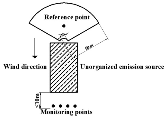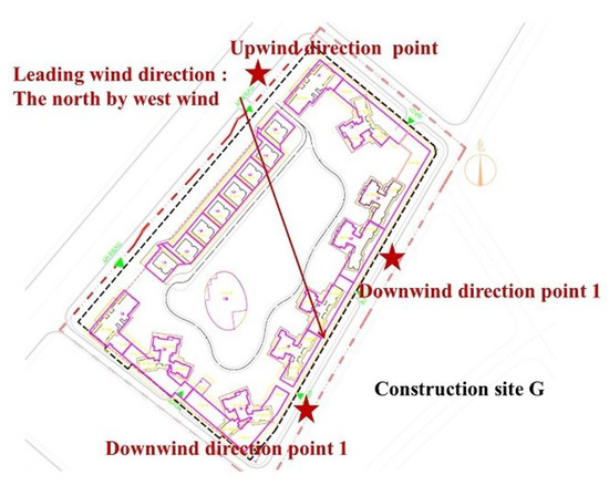 Unorganized emissions are the irregular discharge of atmospheric pollutants without passing through the exhaust funnel, and the construction site is a typical unorganized emission source. Unorganized emission monitoring point setting method in the “Integrated Emission Standard of Air Pollutants” [25] is an important reference for the monitoring point setting method of this study. A reference point was set on the upwind direction of the construction site located at the center of the boundary of the construction site and within a sector of 2 m to 50 m from the boundary. 2–4 monitoring points were set within 10 m outside the boundary of the downwind direction, as shown in Figure 2. The specific layout location can be further referred at the “Technical Guidelines for Fugitive Emission Monitoring of Air Pollutants” [46], taking into account of factors such as meteorological conditions (wind direction, wind speed, illumination, etc.), building distribution, site entrances and exits, site boundaries, etc. It cannot be set on the construction site entrances and exits and the sides of construction road. In order to avoid the contingency of monitoring data, each construction site was continuously monitored for 2–3 days, and the dust concentration data of the up-down wind direction of the construction site can be accordingly obtained.