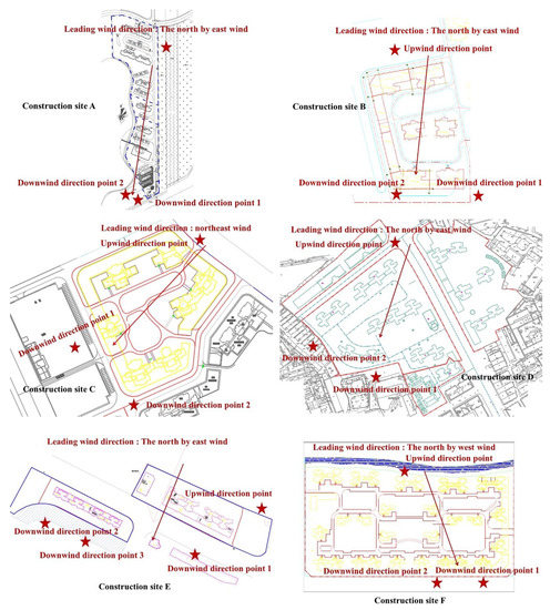 The monitoring construction sites selected are all located in Qingyuan. Seven representative sites were selected as monitoring samples in this study, considering factors of the leading wind direction, the location of the environmental monitoring point, the construction stage of the project, the scale of the project, the location and concern of the construction site. The selected seven construction sites contain different stages of construction and thus can represent the average level of dust emissions. Table 2 shows the specific information of the monitoring construction sites. Figure 3 shows the plan and monitoring setting of construction sites. Pentagrams indicate the location of the monitoring point and the arrow indicates the leading wind direction.
