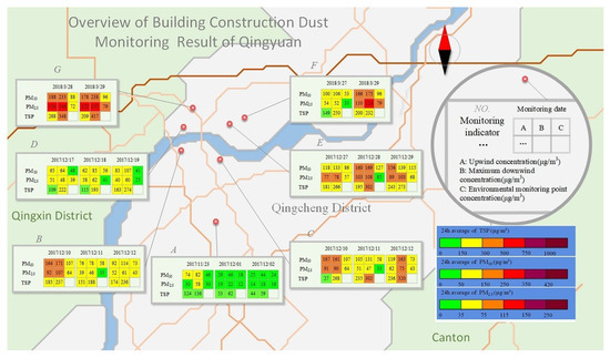 According to the above experimental method, on-site monitoring was organized on the seven construction sites. The monitoring results are summarized in Figure 4. This figure shows the location, monitoring date and monitoring results of each monitoring site. The monitoring was conducted between November 2017 and March 2018, when the Qingyuan was in the winter and spring, respectively. The first column is the upwind direction concentration of each indicator. The second column is the maximum downwind direction concentration of each indicator. The third column is the official concentration of the nearby environmental monitoring station, which represents the basic ambient air quality of the day. The TSP concentration is not counted by the environmental monitoring station in Qingyuan. The darker the color is, the higher the concentration value is. It can be clearly seen that from the absolute value of air quality, Site A had the best air quality on the day of monitoring, while Site G had the worst air quality on the day of monitoring. However, the absolute value of air quality does not reflect the dust pollution caused by construction, which will be properly assessed by incremental indicators. SPSS 23.0 statistical software was used for data analysis in this study.