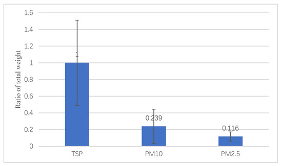It can be seen from Figure 5 that the PM10/TSP is 0.239, indicating that about 76.1% of the particulate matter in the building construction dust emission are larger than 10 μm. This part of the particulate matter will naturally settle under gravity within a few hours, and usually can only move within a short distance, which cannot affect the area far from the construction site [49]. The PM2.5/TSP was 0.116, which indicates that about 11.6% of the particulate matter in the construction dust emission was less than 2.5 μm. This part of the particulate matter can be suspended in the air for a long time without precipitation and transported to thousands of kilometers away by wind [50], and it poses a greater risk to human health [51]. Although the proportion of this part of the particulate matter is small, its influence cannot be ignored. The remaining 12.3% of the building construction dust was a particle with a size between 2.5 μm and 10 μm, and its influence range was between the above two kinds of particulate matter. In general, in building construction dust, TSP:PM10:PM2.5 = 1:0.239:0.116.