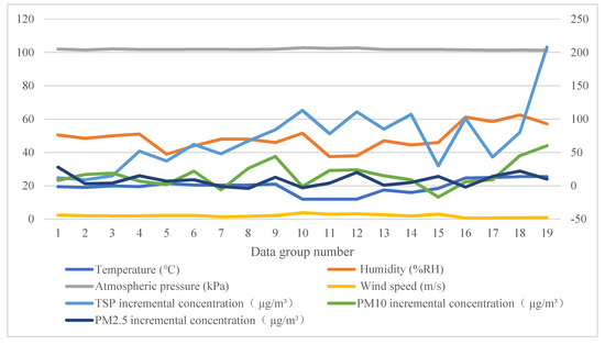 Through to the monitoring of meteorological data, 19 sets of the meteorological data including wind speed, temperature, humidity and atmospheric pressure of each site were obtained. The meteorological data were calculated by the average of the day. As shown in Figure 6, 19 sets of data were drawn into a line chart. Correlation analysis was carried out between dust incremental concentration and meteorological data. The results are shown in Table 9.