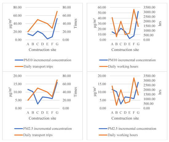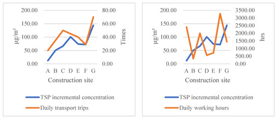 The dust incremental concentration is plotted as a line graph with the daily working hours and daily transport trips, respectively, as shown in Figure 7. The correlation analysis results are shown in Table 10.