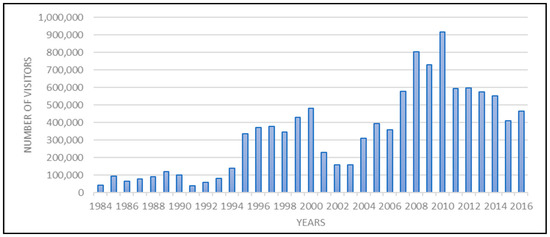 The Petra region is located in the Maan governance south of Jordan (Figure 1). This 755 km2 region includes six communities (Wadi Musa, Taybeh, Rajif, Dlaghah, Baidah, and Um Sayhoun) and a 264 km2 archaeological park. It is home to 31,956 residents [89], who are characterized by their Arab-Islamic culture and restrictive, conservative traditions [90]. In 2009, the PDTRA was established as an autonomous special administrative district to develop the region. The importance of tourism in Petra began to increase after it was listed as a World Heritage site in 1985 and was named one of the new wonders of the world in 2007. There are four major issues that limit the benefits of tourism in the local community: Absence of effective management and community participation in the planning [90,91], fluctuation in visitor numbers (Figure 2), and lack of tourist attractions in the region. Despite the contributions of tourism to the country’s economy, the sector in Petra provides few job opportunities because of the challenges mentioned before. Furthermore, the wages of these jobs are low. Only 1800 persons work in the tourism sector, and around 17% are not Jordanian. At the level of the county, Petra has the lowest number of Jordanian employees in the tourism sector [89]. The unemployment rate in the region reached 9%, with 60% of this figure being women. In spite of women’s ability to work in the tourism sector [92], cultural norms are considered to be barriers to women’s employment [93]. The local community in the region does not benefit much from the city’s income and does not receive sufficient attention from tourism leaders [90].