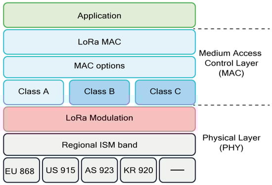 Of the listed technologies, LoRa™ technology, consisting of two layers, has received considerable attention. LoRa is a wireless modulation technique that defines the physical layer of LoRa communication, creating long-distance communication links []. A MAC layer of LoRa, named LoRaWAN (LoRa Wide Area Network), is implemented on top of LoRa PHY, as shown in Figure 1. LoRa Alliance™ defines the LoRaWAN protocol that specifies a network topology, communication protocols, operating options of LoRa nodes, and security [,]. Table 2 also includes technical details of LoRa communication.