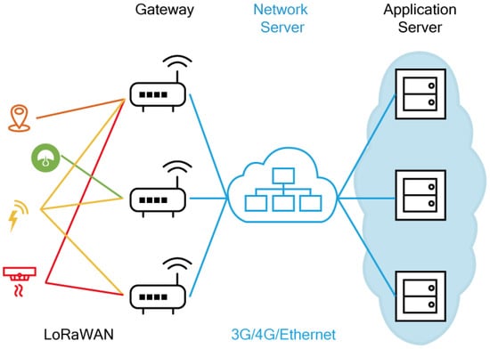 A LoRa network architecture is deployed in a star-of-stars topology in which nodes, gateways, network servers, and application servers are placed (see Figure 2). A node collects sensor records and sends them to a gateway by using single-hop wireless communication with LoRa modulation. The gateway is connected to a central network server via standard IP connections and acts as a bridge between the node and the network server and converts RF signals to IP packets and vice versa. The network server removes duplicated data and determines which gateway responds to the node. It is capable of maximizing the network capacity by controlling the node’s data rate adaptively. An application server is used to collect and analyze data from nodes.