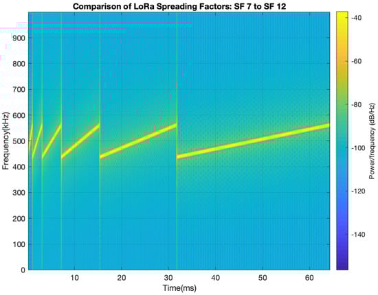 LoRa PHY uses a chirp spread spectrum (CSS) modulation technique, where a chirp represents a sinusoidal signal of a frequency increase or decrease over time. The CSS uses broadband linear frequency-modulated pulses to encode information by sweeping the frequency for a certain period of time (see Figure 3). LoRa PHY is robust to channel noise because it occupies the entire channel bandwidth. It also mitigates external noise by performing frequency hopping on every transmission []. Since a receiver demodulates a unique pattern, it can detect signals lower than a noise floor and has a high tolerance for frequency misalignment between transceivers. LoRa PHY achieves wider coverage at the same power consumption as other communication systems that operate with a higher-frequency carrier. The use of sub-GHz leads to a lower data rate than that obtained with high frequency, but it is suitable for IoT systems that do not require significant amounts of throughput. In addition, a lower data rate reduces the sensitivity requirements of the receiver because it provides benefits in terms of the error rate. The low-frequency nature increases the possibility of reaching a signal through the diffraction phenomenon, even where the line-of-sight (LOS) is not secured. However, with a slow wireless link, there is a greater possibility of a collision by noise and other signal interferences because it increases the duty cycle. It also increases power consumption at both the transmitter and the receiver as a result of a longer transmission delay. Despite these shortcomings, LoRa communication supports the coverage, power, and data rate required by most IoT applications.