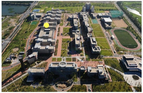 The airplane view of the university’s campus, which is around 600 × 600 m in size. A yellow dot represents Building #7, where a LoRa gateway is installed.