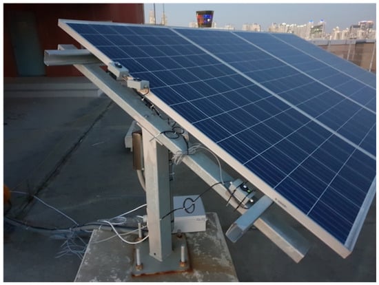 A solar panel and solar irradiance sensors are equipped on the roof of a building on the campus where conventional networks such as Ethernet and Wi-Fi are not connected. A LoRa node (the gray enclosure below the panel) collects and sends related data to a data server via LoRa communication.