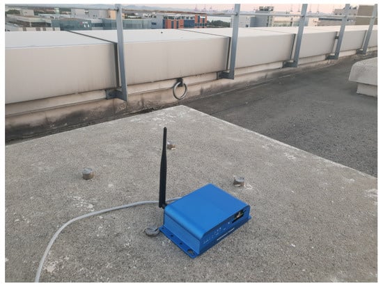 The LoRa gateway used in experiments is installed on the roof of a five-story building about 15 m high. The gateway is placed on top of a reinforced concrete column exposed to the roof of the building, and the roof is surrounded by a parapet and a guardrail.