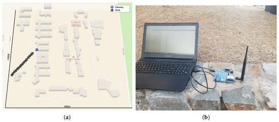 Experimental setup for the outdoor-only environment: a gateway and a moving node. (a) The gateway (blue dot) is on the roof of Building #7 at a height of about 15 m, and the node (✖ mark) is on the ground 10 m from the gateway. Thus, the straight-line distance between them is 18.028 m; (b) The LoRa node is placed on the ground for experiments and is controlled with a laptop computer that powers the node and feeds it data to send. It transmits 100 packets to the gateway once it stops at a location.