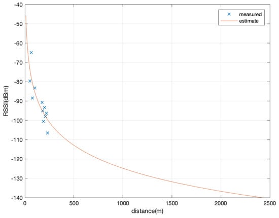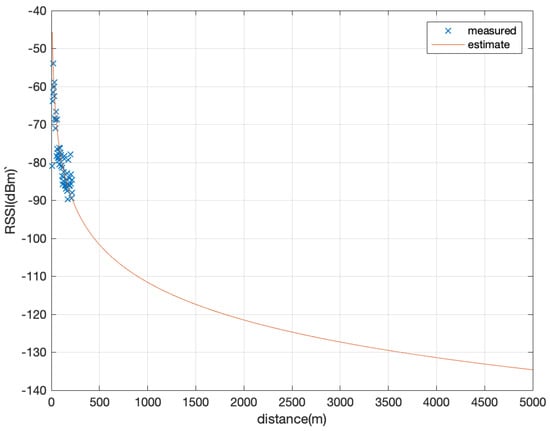 Figure 8 shows the experimental results for the received power of the data signals measured and estimated with increasing distance from the gateway. The blue x marks represent the measurement data in the experiment from which we find the value and complete Equation (3) for the outdoor-only environment. The path loss exponent is computed to be 2.977. It is noted that the value is in the range of 2–4 in a normal LOS environment, but it increases to 4∼6 in a relatively lossy environment, such as buildings and other indoor environments.