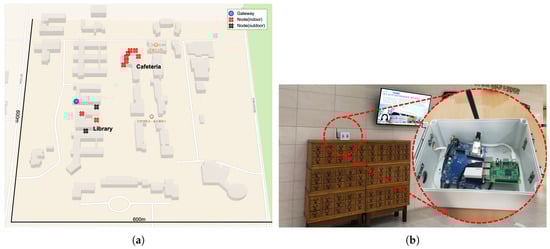 The next experiment evaluates LoRa PHY performance in the combined indoor and outdoor environment. Figure 9a depicts the campus map for this experiment. The gateway stays at the same location, and the nodes (✖ marks) are placed on both the inside and outside of the buildings. The red marks represent nodes inside two buildings—a library and a cafeteria. The library is next to Building #7, and we select two positions on the first floor of the library for the experiments. Nodes protected with plastic enclosures are thus positioned: one is on the floor, and the other is in the drawer, as shown in Figure 9b. There are few students in the area during the experiments. The cafeteria is around 220 m away from the gateway, where several nodes are deployed. Experiments are conducted during lunchtime so that the cafeteria would be crowded with students. The black marks in the figure represent outside nodes on the campus. One node is just next to the gateway, and thus, the LOS communication between them is secured. The other node is on the roadway past the library building. In this setting, the radio signals travel through the library building located in the middle to reach the gateway.