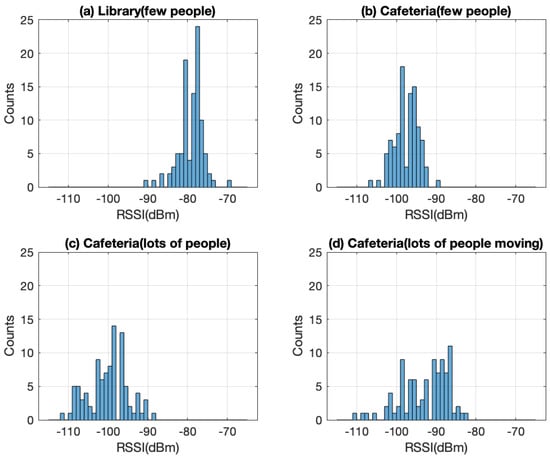Histogram of RSSI values at 4 different locations. (a,b) are recorded at the library and the cafeteria, respectively, where there are few people during experiments. (c,d) are from the crowded cafeteria; the results show that people moving around influence the signal strength. The average/standard deviation values in the histograms are (a) −79.616/3.0862, (b) −97.99/3.0068, (c) −100.51/4.9566, and (d) −93.319/5.4463 for the four locations.