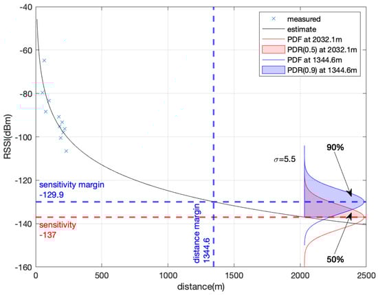 It is noted that 2.03 km and 0.95 km are averaged values. This implies that a node located at the maximum communication distance may fail to transmit data to the gateway with a probability of 50% when assuming that the RSSI values simply follow Gaussian distribution, as shown in Figure 12. Therefore, the maximum range may be shortened if an application requires higher communication reliability. To compute the accurate maximum ranges in a conservative way, this section reports the worst-case measurement data. The standard deviation of the received power in the cafeteria with many obstacles and people moving around is 5.5 dB. It is computed that to increase the communication reliability from 50% to 90% at the maximum distance, the average receiving sensitivity shifts by 7.1 dB, from dBm to dBm. This reduces the maximum communication range from 2.03 km to 1.34 km. Similarly, 2.9 dB must be secured to provide 70% reliability. Table 5 summarizes the maximum communication ranges to achieve communication reliability of 50∼90% with all available SF values in the combined environment.
