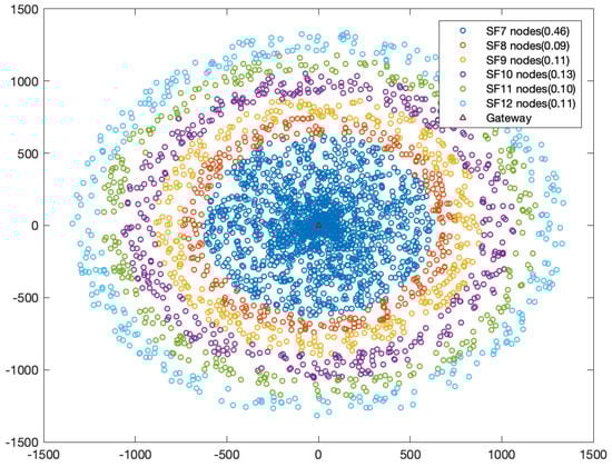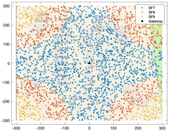 Equations (4) and (6) show that the symbol duration increases when the SF value is increased, which leads to the increase of ToA. Table 8 summarizes ToA values with SF values. It unveils that SF 10–12 do not satisfy the latency requirement of 300 ms so that they cannot be used in the testbed. Figure 21 highlights 3000 nodes deployed on the campus testbed; the gateway is at the center, and low SF values are only assigned to nodes. When a SF 9 node transmits a packet, four SF 7 nodes and two SF 8 nodes on the same channel can send packets in sequence. Thus, SF 7 is assigned by 4/7 among all the nodes; similarly, SF 8 by 2/7 and SF 9 by 1/7. In this way, the campus has 57.1%, 28.6%, and 14.3% of SF 7, 8, and 9 nodes, respectively.