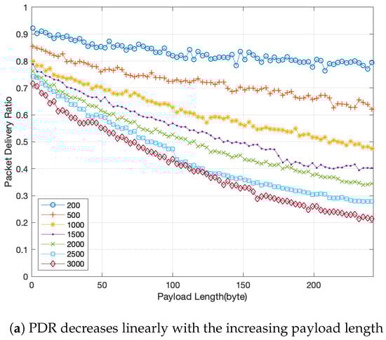 In general, when a node transmits little data, the collision rate decreases, which increases the PDR but decreases the throughput. Table 3 lists the parameters and shows their impacts on the two indicators when their values increase. The parameters are the number of channels, the number of nodes, packet length, or ToA, transmission period, and transmission scheme. Having more channels in the network decreases the opportunity for collision, thus increasing the value of both indicators. Given a fixed number of channels, however, a bigger packet (i.e., long length) indicates longer ToA and is likely to increase collisions and decrease the PDR. Please note that delivering the packet implies the transmission of more bits of data. The data period also influences LoRa MAC performance. If data are transmitted quite infrequently, the chance of collision decreases. LoRa has two options for transmission: confirmed and unconfirmed. Upon receiving a data packet from a node, with the confirmed message type, a gateway sends an additional packet back to the node to acknowledge the receipt of data. Unless the node receives the response, it retransmits the data, which places a considerable load on the network [].