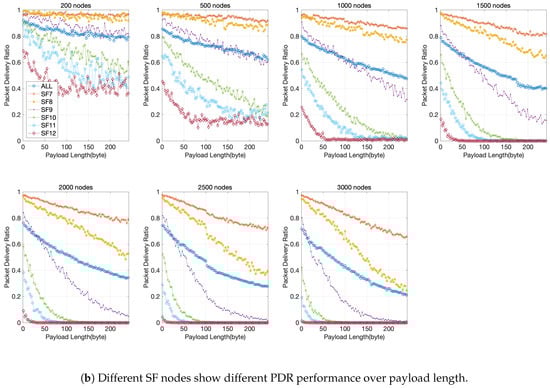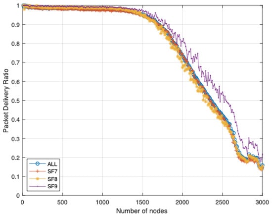 As the number of nodes increases, performance degrades. The higher the SF value, the lower the PDR. An interesting observation is made for the SF 7 nodes. With 3000 nodes, PDR performance for SF 7 nodes goes below that for SF 8 nodes when the threshold becomes higher than dBm. It performs even worse than that for SF 9 nodes after a threshold of dBm. This is mainly attributed to the huge number of SF 7 nodes; around 1,380 nodes at SF 7 are deployed while there are 250 nodes and 300 nodes at SF 8 and 9, respectively. As the threshold increases, the detection range decreases, which prevents an SF 7 node from detecting that neighboring nodes are transmitting. This results in packet collision because there are many SF 7 nodes nearby. With 1500 nodes, on the other hand, fewer nodes are deployed, and thus, this hidden terminal problem barely affects PDR performance.