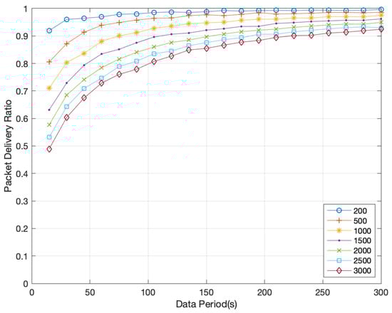 The authors ran another experiment that set the size of an application payload to 8 bytes and used a single channel. In this experiment, they increased the data period from 600 s to 60,000 s, varied the number of gateways from 1 to 4, and then evaluated MAC performance. Their results confirm that the PDR increases exponentially as the data period increases. With respect to the gateways, the PDR achieves 70%, 89%, and 96% when 1, 2, and 4 gateways are deployed in an area with 10,000 nodes that send data every 600 s. This illustrates the possibility of using multiple gateways to improve LoRa performance in a dense environment. Our experiments used the LBT scheme on multiple channels, so it is impossible to compare our results to theirs directly. However, both results indicate that there is a trade-off between the number of nodes and the data period to achieve a given level of LoRa MAC performance.