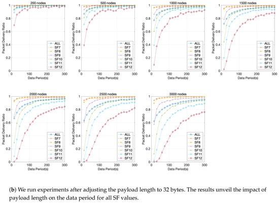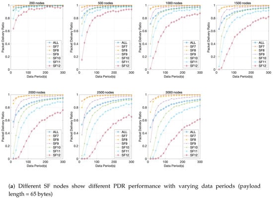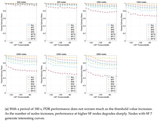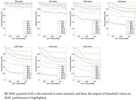 To highlight the impact of threshold values on MAC performance, the experiment presented in this subsection stresses the network more by reducing the data period from 180 to 60 s. The experimental results are shown in Figure 17b. With 3000 nodes, performance degradation for SF 7 nodes becomes noticeable; the PDR is 56% for a threshold of dBm. The graphs also illustrate that performance appears best at dBm for most cases of SF values and stabilizes after −120∼−110 dBm. This implies a recommended setting for the threshold value for LBT sensing of less than dBm for the best performance. It is also noted that when comparing the results in Figure 17a, lower PDR performance does not mean lower network performance. When using the longer period of 180 s, fewer data are transmitted, ultimately decreasing network use. Therefore, the possibility for collision decreases, although there are hidden terminals, minimizing the impact of the threshold value on PDR performance.