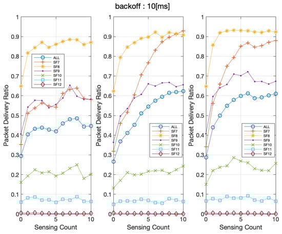 With respect to the ToA CW algorithm, the two graphs on the right in the figures are the same because does not change. The graph reveals that the PDR at SF 7 nodes becomes stable after reaching a sensing count of 5 and is greater than that at SF 8 and 9 nodes. Moreover, the PDR is lower than that at SF 8 nodes. The huge number of SF 7 nodes and the short (66 ms) explain these results: severe contention occurs among many SF 7 nodes, and thus, it takes time to detect an empty channel (i.e., more trials of sensing are needed). In the case of SF 8, contention is avoided after two consecutive sensing counts since there are fewer nodes (250 nodes). A similar pattern appears for SF 9 nodes (300 nodes) but with a worse PDR performance. The difference is mainly attributed to the relationship between the data period and their . Nodes at SF 9 send data every 60 s but must wait two times longer (226 ms at max) than the duration with SF 8 nodes. This increases the possibility of contention.