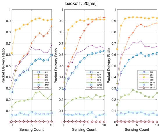 Regarding the fixed CW algorithm with a of 10 ms, PDR performance at low SF nodes (7–9) varies within a 10% range for all the sensing counts except for 0 (see the left graph in Figure 18). A short and fixed value explains this pattern. Each node retries data transmission after waiting for a very short back-off time, and these retransmission attempts quickly saturate the network capacity. Moreover, since is fixed, the intensity of contention does not lessen, even though the sensing count increases. When doubling to 20 ms, PDR performance rises with the increasing sensing count, as shown in the left graph in Figure 19. In particular, PDR performance at SF 7 nodes continuously increases. This indicates that a longer back-off time can lessen the network contention that occurs when a node keeps trying to transmit data. It is noted that with a sensing count of 10, PDR performance (85%) becomes as good as the maximum performance at SF 7 nodes with the ToA algorithm (see the right graph of the same figure). Recall that SF 7 nodes in two algorithms use fixed values: 66 ms and 20 ms. When using 66 ms, PDR saturates at a sensing count of 5 as compared with saturating at a sensing count of 10 when using a 20 ms back-off time. This indicates that the maximum performance of 85% in the fixed algorithm is a saturated value.