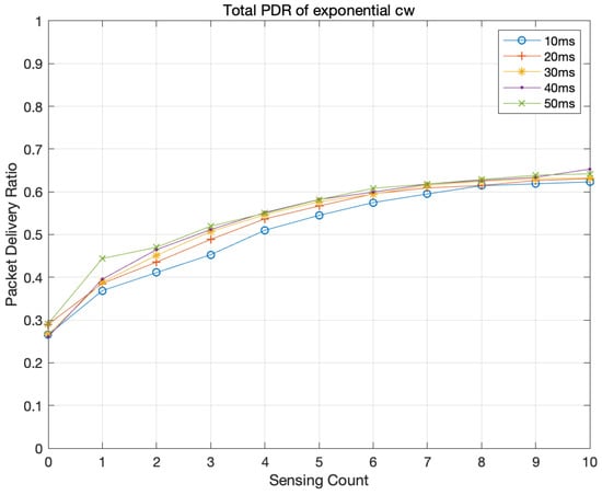 We record PDR performance with an increasing number of sensing counts after setting to 10 ms. The left, middle, and right graphs represent the case of fixed, exponential, and ToA algorithms, respectively.