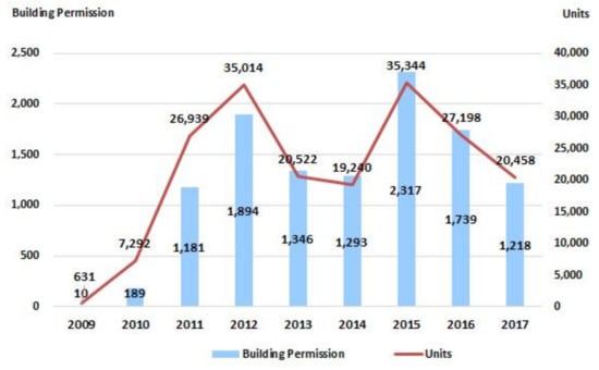 In response to surging demand for small urban houses, shrinking residential stability, and increasing burden of housing expenses of single and two-person households in Korea, the government revised the Housing Act and introduced the Urban Residential Housing (URH) program at the end of 2009. The URH represents studio-type housing, and row housing and multi-household housing in a complex with less than 300 households constructed in urban areas Specifically, a dwelling unit of studio-type housing shall not exceed 50 m2, while it is equipped with an independent bathroom and kitchen; both row housing and multi-household housing in a complex can be built up to five floors. It aimed to secure residential stability, residential amenities in the community, and to provide a plentiful supply of affordable small housing. The number of urban residential houses (URHs) permitted for construction in the SMA from 2009 to 2017 was 11,187 buildings and 192,638 dwelling units. The total number of URH permitted between 2009 and 2017 was 11,372 buildings based on the data provided by the Seoul Metropolitan Government (SMG); 185 buildings that were deemed redundant were not included. Since the introduction of the new housing program in Seoul, most researchers have agreed that it has significantly contributed to meeting the demand for housing for small households. However, it has been argued that housing policies and strategies need to be established to enhance the quality of residential and living environments. It has also been claimed that the housing policies are required to alleviate the burden of rents and improve the housing affordability for the households [3].