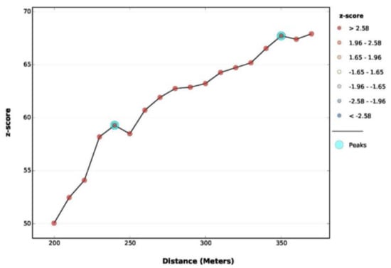 In order to determine an optimal distance for the spatial clustering pattern analysis, it is crucial to consider that at least one spatial unit should be included from a spatial unit of analysis. One method applied in this study is to explore the distance from the centroid of a census tract with the reference distance of 200 m and increments of 10 m. Through the simulation, we can investigate the distance that the z-value is maximized. The result, as can be seen in Figure 3, show that at 240 and 350 m, the spatial autocorrelation is maximized.