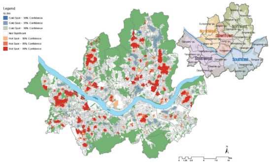 The result of the spatial clustering pattern analysis is shown in Figure 4. Among a total of 19,061 census tracts subjected for the analysis, there are 2962 hotspots and 1805 coldspots. It can be seen that large hotspots are formed in Gangseo-gu and some parts of the Yangcheon-gu in the southwestern subregion, Dongdaemun-gu and Seongdong-gu in the northeastern subregion, Eunpyeong-gu in the northwestern subregion, and some sections of Jungnang-gu in the northeastern subregion in the metropolitan area. The hotspots can also be observed in Gangdong-gu, Gangnam-gu, Gangbuk-gu, and Yeongdeungpo-gu.